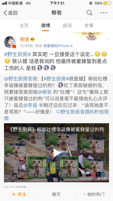 《野生厨房》的官方微博发文称“吃了美厨娘做的饭,就要接受美厨娘@柳岩的吐槽!”柳岩转发并霸气回应道“话是我说的”,对吐槽李诞长相的事作出正面回应,确实直率!网友们在被她和李诞逗笑的同时,也不忘为她的率真点赞。