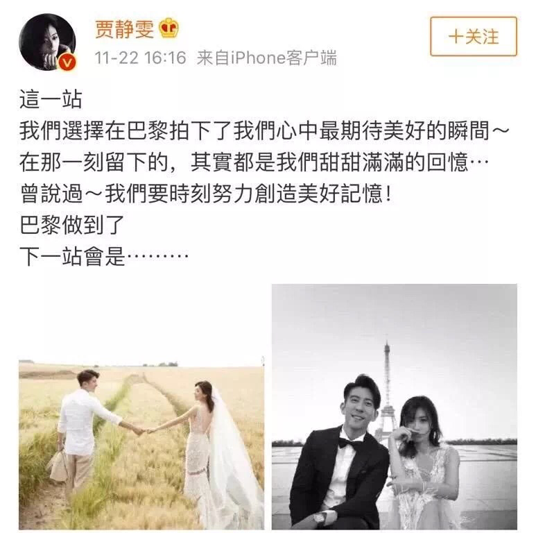 近日贾静雯在微博中发布,十一月二十五日,她和丈夫修杰楷将在巴厘岛补办一场婚礼。