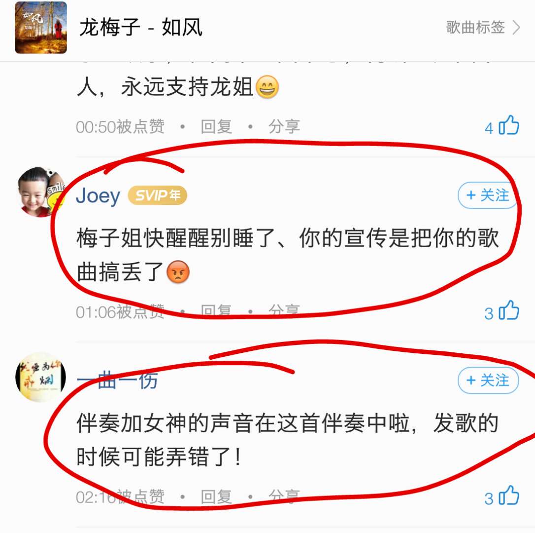 在评论区,不断有人吐槽,有网友说:“刚打开这首歌的时候,一点声音也没有,前奏音乐也没有,还以为是自己的手机坏了。”还有网友表示:“宣传团队放一首清唱的歌曲出来,是故意陷害龙梅子的吗?”还有的调侃说:“听这首歌还得准备两个手机,一个放歌曲,一个放伴奏”。更有龙梅子的粉丝,义愤填膺的喊话“梅子姐快醒醒,你的宣传把你的歌曲搞丢了”。然而,将近一天的时间过去了,龙梅子和宣传团队方面还没有露面澄清,是在让人匪夷所思。有这样的团队,对于一个歌手来说,也真的是够糟心的了。