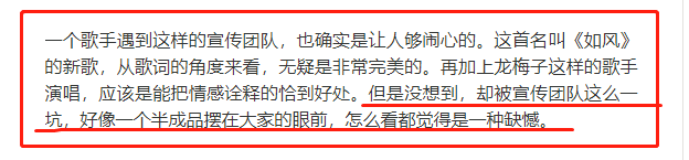 11月29日,龙梅子新歌《如风》发行后,被网友指责为乌龙事件,上传的版本只有清唱却没有伴奏。这种致命性的错误发生在一个歌手身上,实属不应该。在音乐软件的评论区中,网友们纷纷吐槽,但是也有不少人认为,这件事情要怪还是宣传团队的责任,歌手本人不可能包括上传音乐等方面事无巨细的负责。