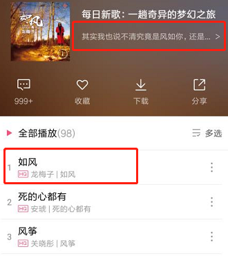 在千千音乐首页新歌首发板块,龙梅子的这首《如风》得到编辑的青睐,同时也受到了网站用户的喜欢。某网站新歌首页的推荐语中写道:“其实我也所不清究竟是风如你,还是你如风”,简短的几句话就诠释了龙梅子的这首歌曲,在歌单排行榜中也稳居第一的位置。