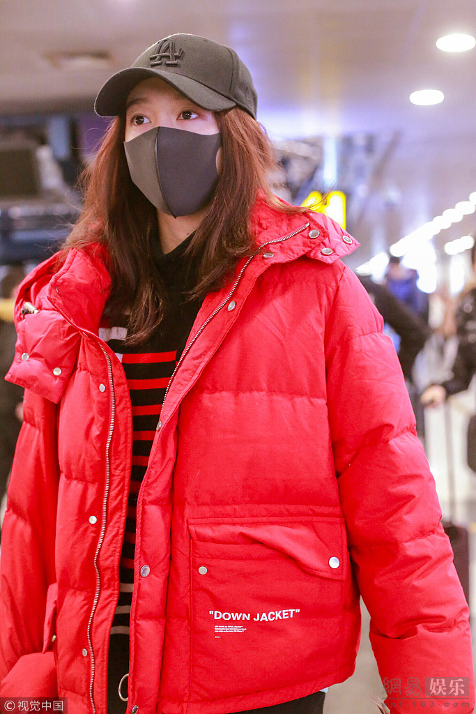 此次关晓彤虽然被网友称为机场秀,但可以看的出来关晓彤并没有像一些“机场女王”一样展示自己的身材和颜值。照片中,关晓彤身上穿着一件看起来超厚的红色羽绒服,内搭黑红色条纹毛衫,黑色鸭舌帽黑色口罩让整个造型显得简单随意,如果不仔细看还很难发现是关晓彤。