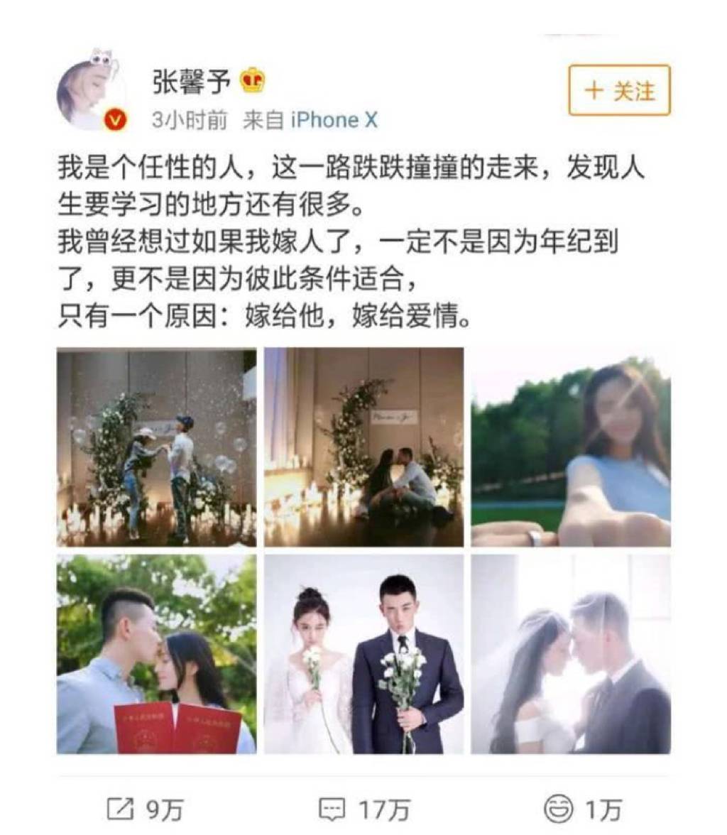 有人说两人是奉子成婚,八月到十二月正好五个月嘛,而张馨予正好怀孕五个月了,我倒觉得无可厚非,倒是更加相信张馨予之前发的那条微博,