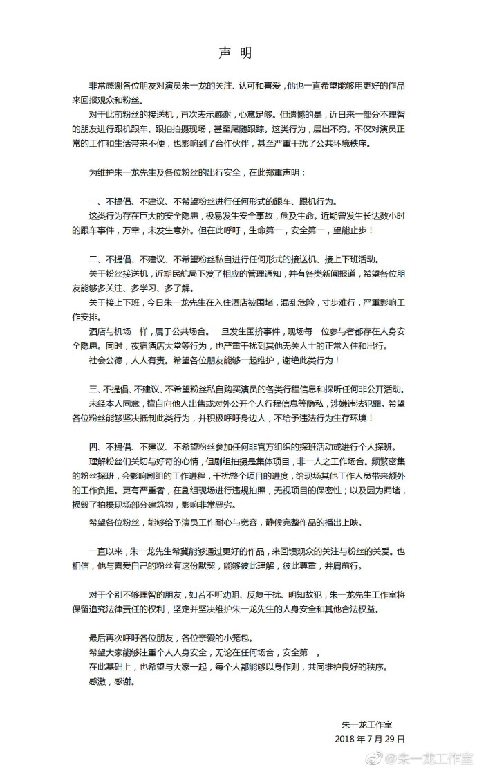 面对这样的“骚扰”,忍无可忍的朱一龙通过个人账号反击了,发出一则声明,希望网友们能够理智追星,不要做任何过分的事情。