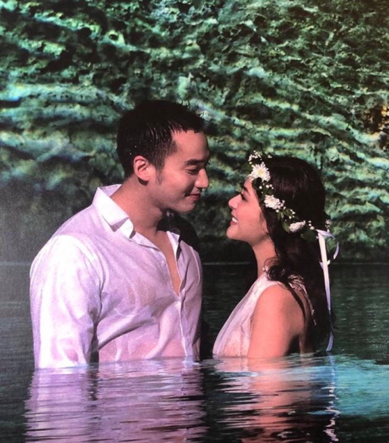 我们可以看到他们的婚纱照当中,阿娇穿着一件白色的婚纱,头上还戴着非常可爱的花环,老公赖弘国穿着白色的礼服。人在水中,非常深情的互视对方。