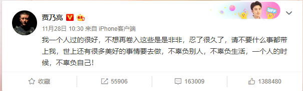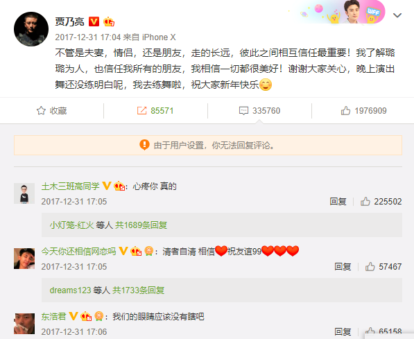 但是好景却不长,2017年的最后一天,李小璐的夜宿门被曝出,一时间喧嚣不已,牵扯到的好几个明星都纷纷出面澄清,包括贾乃亮本人。他说“彼此信任最重要,了解璐璐为人,也信任朋友”,但照样遭到了排山倒海一般的留言。在留言中大致可以分为几个类型,一是安慰,希望他心胸开阔一点;二是怂恿的,希望他擦亮眼睛;三是冷嘲热讽的;四是发自内心同情他的。