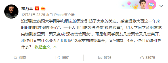 沸沸扬扬的争议中,贾乃亮被迫再次出面澄清,和大学同学、朋友吃饭被拍。在言语之间,可以看出来贾乃亮的无奈,正如他所述“一个人出门吃饭是孤独寂寞,和朋友吃饭聚会就成了深夜密会两女”,并且澄清,十二点左右离开的……这样的报道,究竟是想引导什么呢?