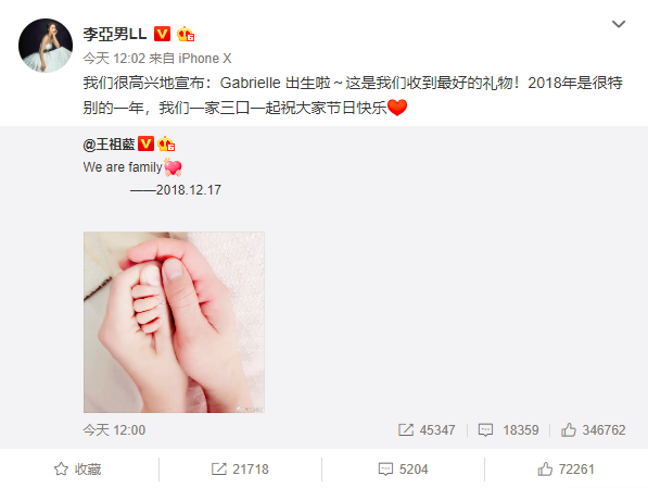 随后王祖蓝也发了微博,表示自己喜悦的心情,也送上了对妻子的慰问。他还发了一张一家三口握着手的照片。可见这个小宝贝一出生就被爸爸妈妈保护着,非常的惹人爱。