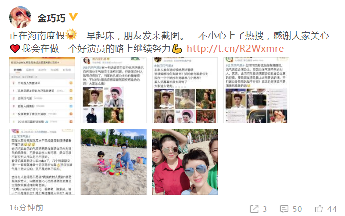 而金巧巧很快便做出回应,称自己在海南度假,感谢大家的关心自己会在做演员的路上努力。