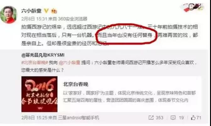 杨洁导演在拍西游记续集的时候决定让新人来演,可是六小龄童为了争取续集的角色,在微博上开始打人情牌,表示自己为了孙悟空付出了太多,拍戏时很多危险的戏都是自己亲自上。