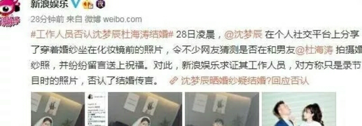 随后工作人员便对此作出了回应,否认了杜海涛沈梦辰结婚的传言,称沈梦辰的婚纱照只是录节目需要的。而有媒体又打电话联系沈梦辰的经纪人,得到的回应也是否认了结婚传闻。工作人员的说辞犹如一盆凉水一样泼在了大家的头上,尤其是让无数的CP粉大失所望啊。