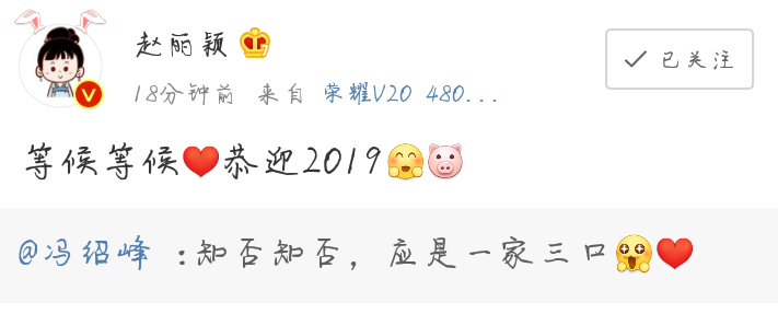 冯绍峰在1号中午在微博上跟大家分享了这个喜讯,称“知否知否,应是一家三口!”宣布赵丽颖怀孕的消息,随后赵丽颖转发微博“等候等候,恭迎2019!”。这对小夫妻连宣布怀孕都是默契十足,竟然说出了新春对联的感觉,给2019新的一年的增添了一件喜事!