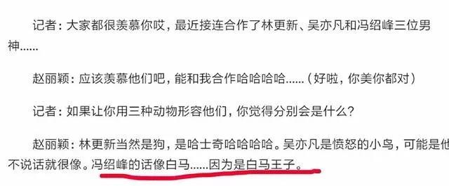 赵丽颖一直是被大家团宠的小公主,之前被问到冯绍峰像什么小动物,颖宝更是笑的一脸甜蜜的说到,“他像白马,因为是白马王子”。