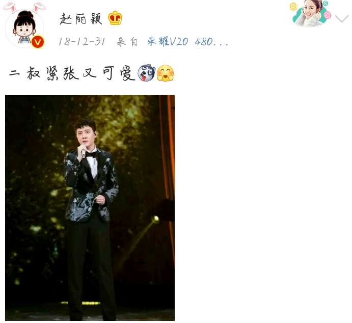 昨天,冯绍峰参加了湖南卫视的跨年演唱会,看完冯绍峰表演之后的赵丽颖,很快在微博上调侃自己的老公“二叔真是紧张又可爱”。公开撒狗粮的小两口,真是让大家猝不及防的甜蜜暴击啊!