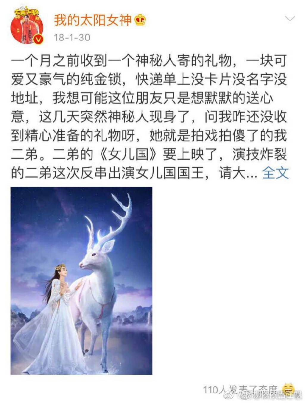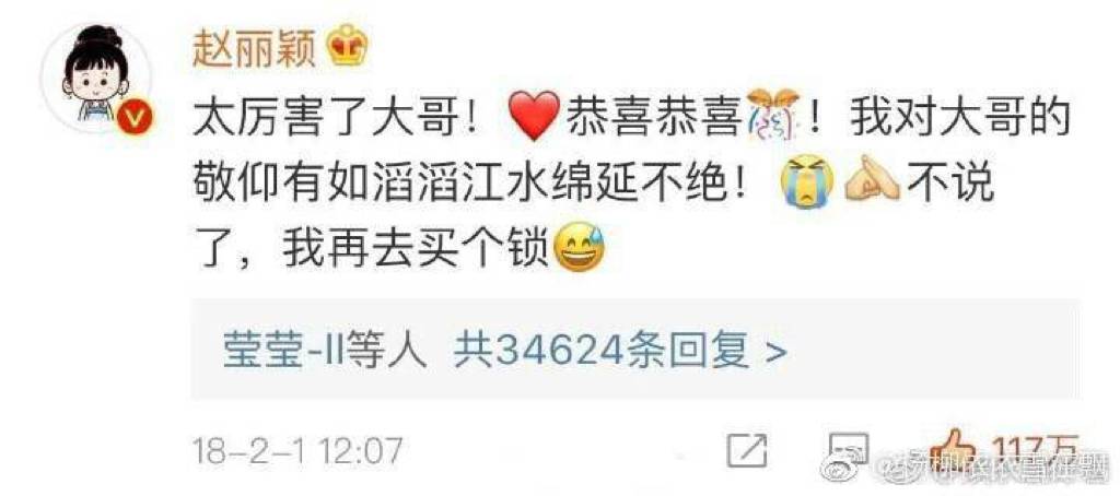 微博还跟赵丽颖互动“买锁”的事情,原因是她生宝宝时赵丽颖送她了一把小金锁,而赵丽颖怀孕了,所以她也要还一个。