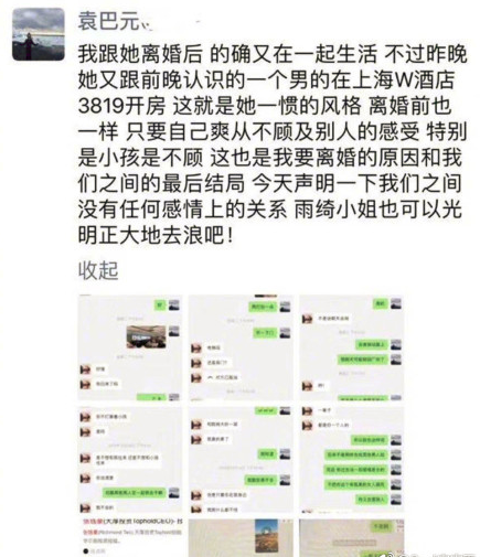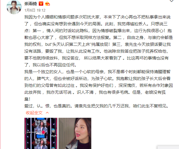 2019年的第一个大瓜,还是2018年开的花,那就是关于张雨绮的婚姻。1月6日,张雨绮的前夫袁巴元在朋友圈倾诉自己的婚姻,并且连续放出了九张图片,每张图片都是针对张雨绮的实锤。