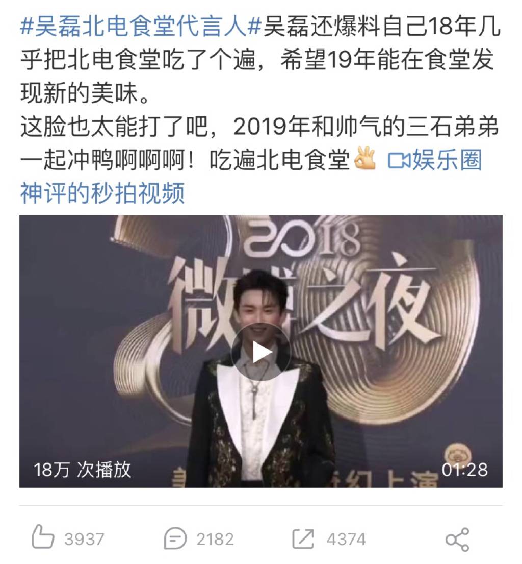 考入北京电影学院的吴磊,也是十分接地气,没有跟别人不一样,而是享受其中的生活,今天还因为吃学校食堂惹笑了众网友。吴磊称2018年吃遍了食堂所有的菜色,希望2019年能出些新的菜式。