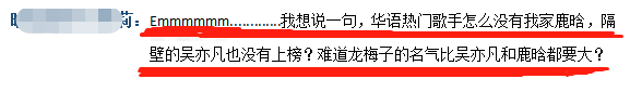 甚至还有粉丝质疑,龙梅子名气肯定没有鹿晗吴亦凡的大,为什么都能够排在第二名呢?不要急躁,请允许沉着冷静的小编在对他们的音乐分别听了一遍之后,发现了背后的秘密:“热门”不仅仅是热,还需要有价值,有代表性。这个不论粉丝的多少,不论名气的大小。