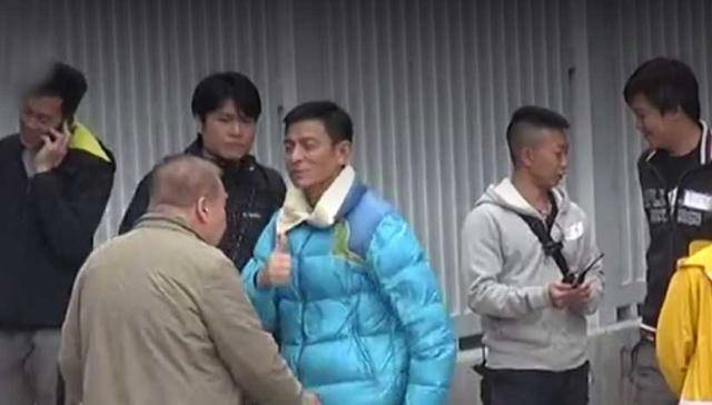 在拍摄的照片当中,刘德华穿着蓝色的羽绒服和影片拍摄现场的工作人员们沟通。