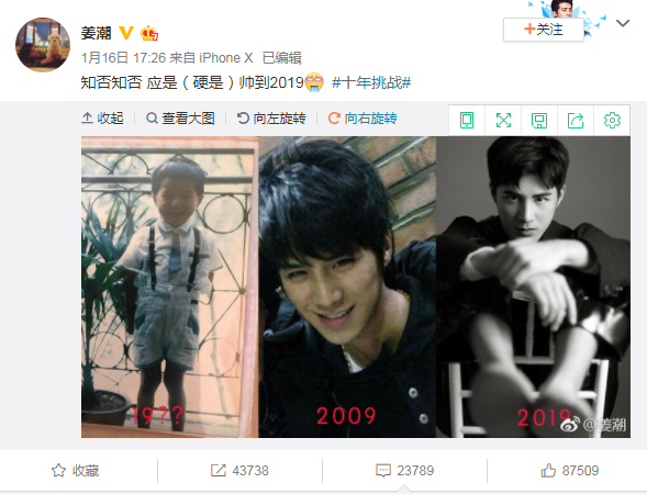 近日,姜潮发微博“知否知否,应是(硬是)2019”并po上三张自己小时候和2009年于2019年的照片。微博一出就有网友给姜潮留言称,是不是要给《知否》做宣传呢?还有网友留言问姜潮是否也在追《知否》这部剧?