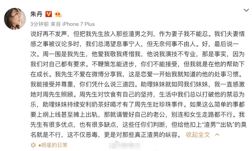 回头再看朱丹的那一段发文,不就是最好的明证吗?对于周一围曾经和女助理的“吐珍珠”事件,朱丹矢口否认,相信周一围,相信女助理。因为在朱丹看来,对于周一围的爱情,她实际上是真正拥有“爱情专属权”的,这一点自然不会改变。