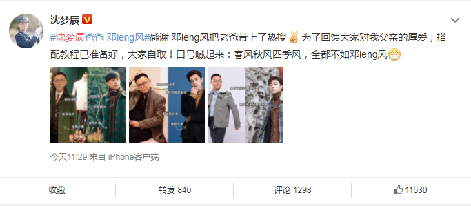 邓伦曾经也自曝自己非常喜欢时尚单品,随着这两年人气的不断爆发,这个很会穿衣的时尚boy衣品一度成为很多网友模仿的对象。所以,沈爸爸能这么热衷于“邓leng风”也不是没有道理的。