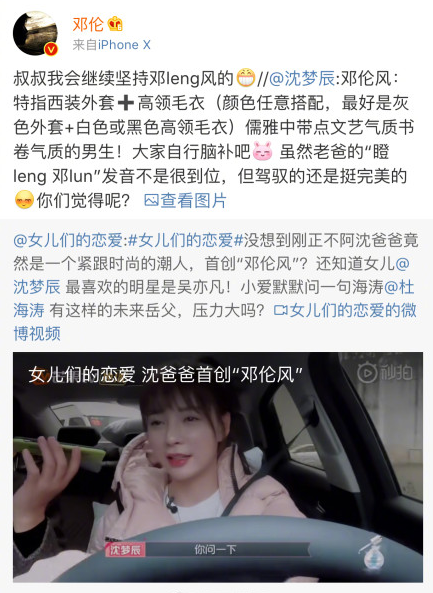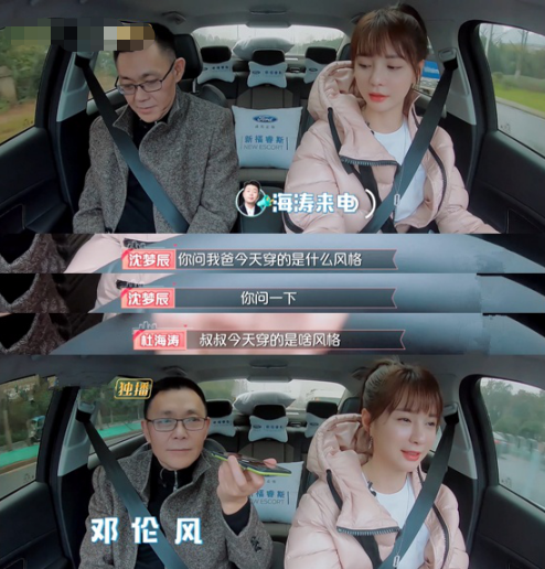 沈梦辰与老爸沈平录制真人秀节目中,两个人在车上,沈梦辰问老爸适合什么风格,而老爸的回答是“邓leng风”一旁的沈梦溪听后更是笑的不歇。甚至在杜海涛来电话后,沈梦辰让杜海涛问沈爸爸穿的什么风格,这次沈爸爸终于把字咬清楚了,说自己穿的是“邓伦风”。