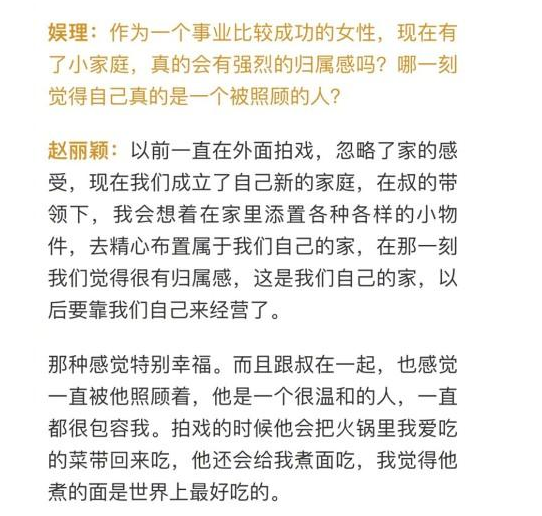 一段时间的沉寂,大家更是好奇婚后的赵丽颖究竟如何评价婚姻,如何评价自己的丈夫冯绍峰。面对记者的采访,赵丽颖掏心窝子的说出了一番话:“在叔的带领下,我会想着在家里添置各种各样的小物件”。赵丽颖喜欢叫冯绍峰是叔,而不是老公。他们二人苦心细致的经营这个家庭,经营他们的婚姻。