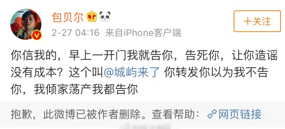 2019年2月27,有网友在微博造谣包贝尔的负面。凌晨四点多,包贝尔转发并且辟谣:早上一开门就告你。“就算是倾家荡产我都告你”,为了维护自己的家庭,照顾妻子的感受,同时也维护自己的名誉,包贝尔的表现被网友盛赞。