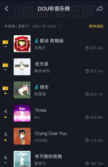 就在最近,歌手龙梅子的一首歌曲,接二连三出现在抖音音乐榜单的第一位置。截止3月21日,这首歌曲再次成为抖音音乐榜的第一名。在一定程度上,就印证了这个道理。