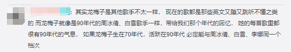 龙梅子一条微博底下的评论这样写道:“其实龙梅子是其他歌手不太一样, 现在的歌都是那些英文又蹦又跳听不懂之类的 而龙梅子就像是90年代的周冰倩、白雪歌手一样,带给我们那个年代的回忆, 她的每首歌里都很有90年代的气息, 如果龙梅子生在70年代,活跃在90年代 必定能与周冰倩、白雪、李娜同一个档次”。