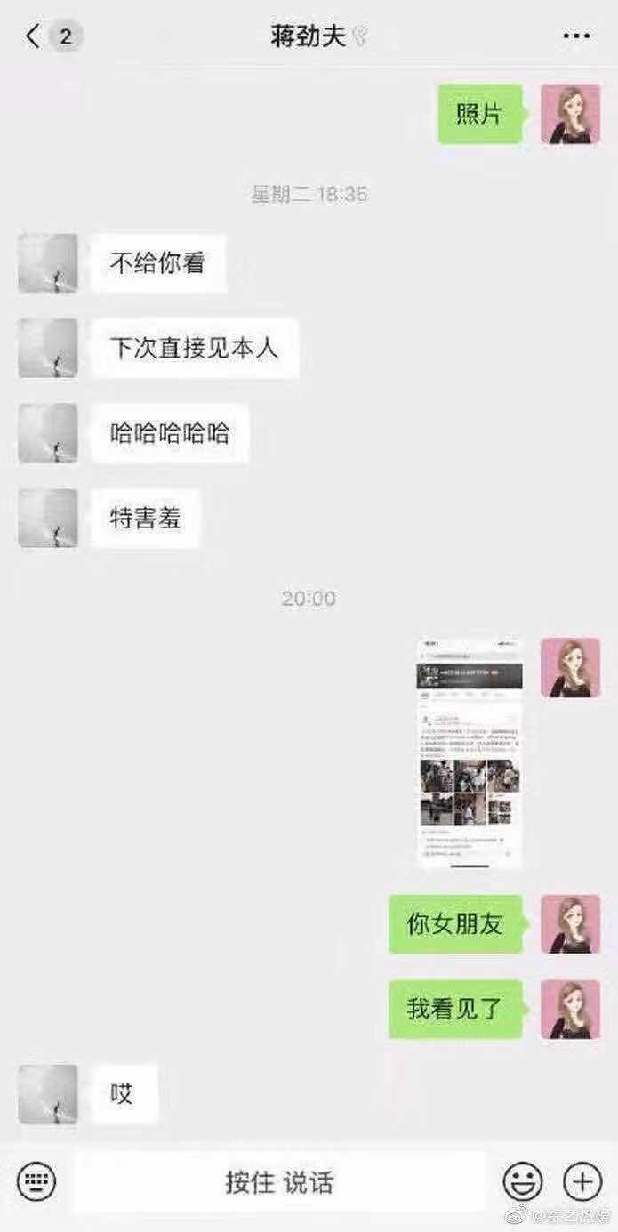 最近,男演员蒋劲夫新恋情曝光,有网友晒出了在上海迪士尼偶遇蒋劲夫携女友出现的照片,在照片中,蒋劲夫头戴黑色鸭舌帽,带着自己蓝眼睛的外国女友,女友身材丰满,皮肤白皙,个头不是很高,五官却很精致,看得出是蒋劲夫喜欢的类型。还有蒋劲夫好友晒出的二人聊天记录,说要看蒋劲夫新女友的照片,而蒋劲夫却说:“不给看,她害羞。”看得出是对新女友十分宠爱了。
