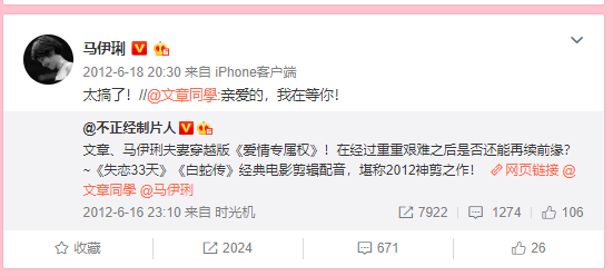 这条微博是7年前的2012年,有网友根据文章和马伊琍曾经饰演过的角色精简出来的一段长达3分多的视频片段,配上了《爱情专属权》作为背景音乐。深得网友们的赞赏,也得到了文章和马伊琍的认可。