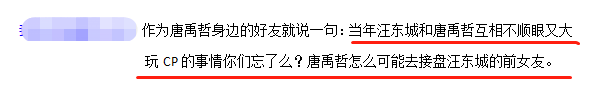 将近一整天的八卦传言,也让不少路人信以为真。直到有自称是接近他们的某网友说的一段话,才让大家心头的疑云解开了。在某论坛讨论唐禹哲的新女友和汪东城关系的一则帖子里。有网友留言如下图。