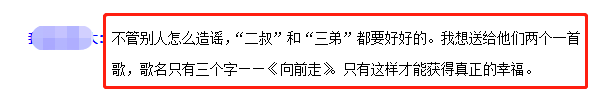 有自称是喜欢了冯绍峰和赵丽颖好几年的粉丝,从他们的恋爱关注到他们的结婚,再到现在的谣言。他说,不管别人怎么造谣,“二叔”和“三弟”都要好好的。我想送给他们两个一首歌,歌名只有三个字——《向前走》。只有这样才能获得真正的幸福。