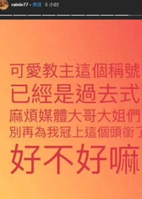 为了能够撕掉这个标签,杨丞琳甚至亲自上阵,在某社交网站上发文,“可爱教主这个称号已经是过去式,麻烦媒体大哥大姐们别再为我观赏这个头屑了,好不好嘛”。但是这种近乎哀求的语气,并没有实现她的这个“小小愿望”,媒体和网友们依然用“可爱教主”这个词来形容她。
