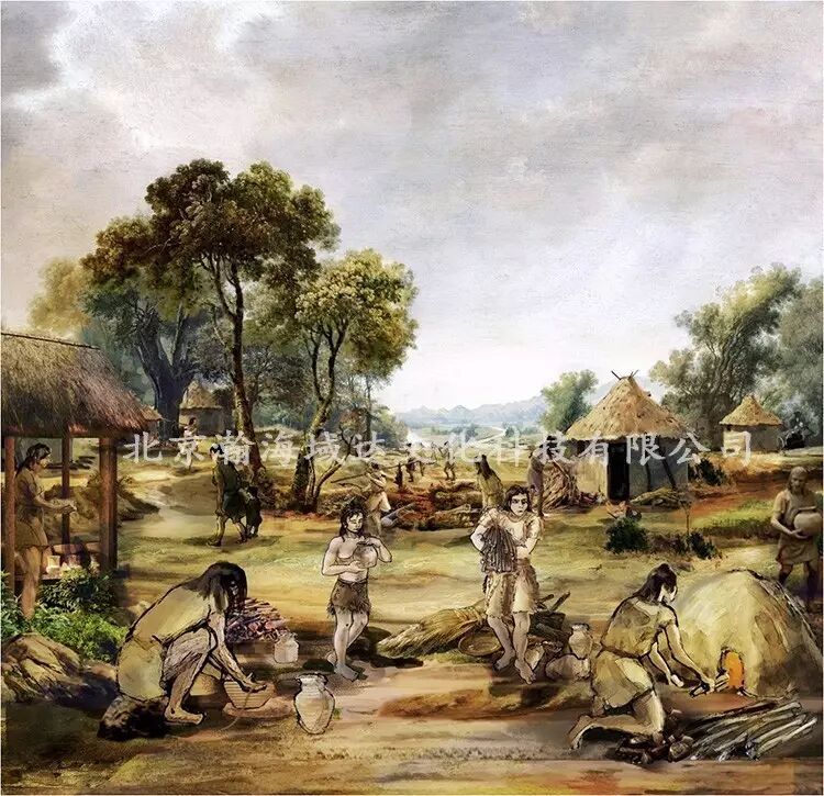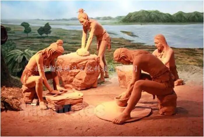 场景采用单色雕塑加半景复原的表现形式,表现在原始部落内原始人劳作和生活的情景,前面的实体雕塑人物为四个,人物分别为:一位女原始人在拉胚制作陶器,一位男性原始人在烧制陶器,画面上一位女性原始人抱着柴火向烧制陶器的地方走来,拉胚的原始人旁站着一个搬运陶罐的小孩。背景油画延伸部落内的房屋,近处的河流,远山与天空以及原始人在河流浅水区捕鱼,缝制兽皮、切割食物等生活情景。