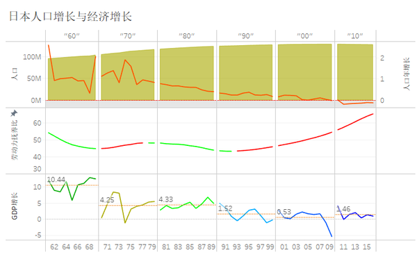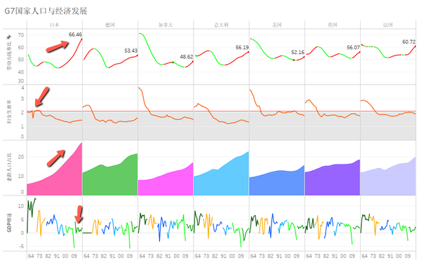 在很多经济学家眼中,日本过去二十多年经济的缓慢增长,多被归因于在美国金融霸权下签订的“广场协议”,而人口老龄化带来的劳动力抚养比上升对日本经济增长的严重影响,并没有被足够重视。与处于同等发达水平的G7其它国家相比,单一民族为主要国民构成的日本,并没有通过大量移民的方式,改变由于妇女生育率下降带来的劳动力供给不足和人口增长均衡性下降的问题。截止到2017年,日本的劳动力抚养比已经上升至66%,老龄人口比例也接近30%,无论是劳动力抚养比还是老龄人口比例都是G7国家中最高的。虽然,日本不是G7国家中,第一个进入劳动力抚养比持续上升的国家,但是却是劳动力抚养比和老龄人口比例增长最快的国家,也是人口增长均衡性下降最快的国家。与其它G7国家相比,日本经济增长速度也是受劳动力抚养比增长影响最大的国家。