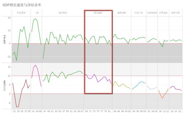 战后通胀期是美国经济发展的转折点,虽然从上个世纪80年代后,美国的通货膨胀率逐渐恢复到2%以下的较低水平。但是,从战后通胀期开始,美国国民收入净结余与美国国民总收入的比例所呈现出的下降趋势,一直延续至今。