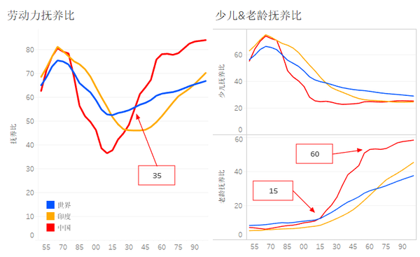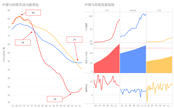 与中国相比,劳动力抚养比下降速度明显缓慢的印度,失去的是在世界劳动力抚养比上升之前,快速发展的机遇。