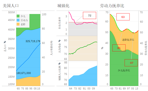 1972年,美国妇女生育率已经低至2.1以下, 美国已经进入了人口存量增长的模式。虽然移民政策带来了妇女生育率的小幅度上升,在较低的妇女生育率和人均寿命增长的双重影响下,2007年,美国劳动力抚养比再次进入了上升趋势。