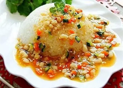 •最好,将做好的鱿鱼菜汁浇在热气腾腾的米饭上,就可以开吃啦。
