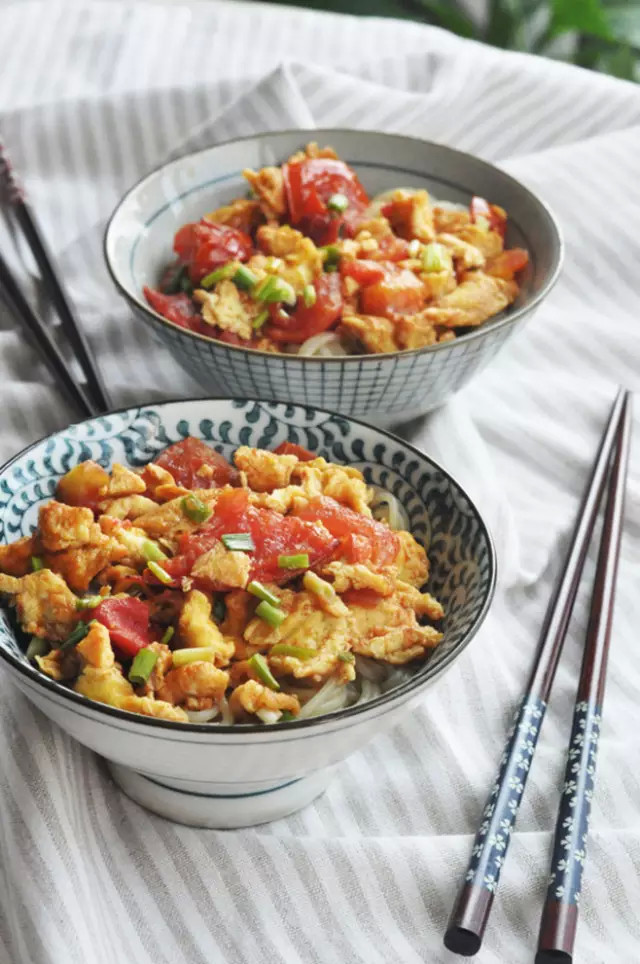 •盖上锅盖煮2分钟,待番茄煮软以后,倒进炒好的鸡蛋翻炒均匀,放盐、放葱花后浇在米饭上。