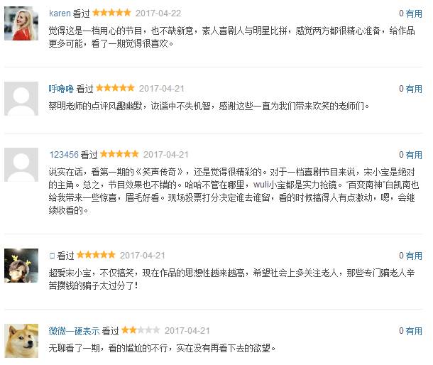 目前节目播出两期,收视率在同时间段排第一位。蔡明的真情流露,宋小宝的损色搞笑,大兵的沉稳幽默,白凯南、大张伟的模仿逗比,乔杉、修睿的反转讽刺以及常远的奔放欢脱,传奇笑匠实力依旧。前来挑战的新锐笑匠也个个实力不凡,目前张番、刘铨淼相声“津门新锐”挑战成功。网友的评价赞誉胜过吐槽,优于《欢乐喜剧人》第三季的表现。