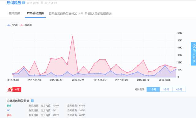 而据下图微指数显示,《白鹿原》的舆情传播在PC端较为平稳,在移动端较为突出,依据这一搜索行为也能大致推测出该剧在年轻群体中有较强的关注度。其中在5月20日达到峰值,当日传播效果最为显著的是关于秦海璐的一条微博。