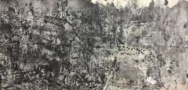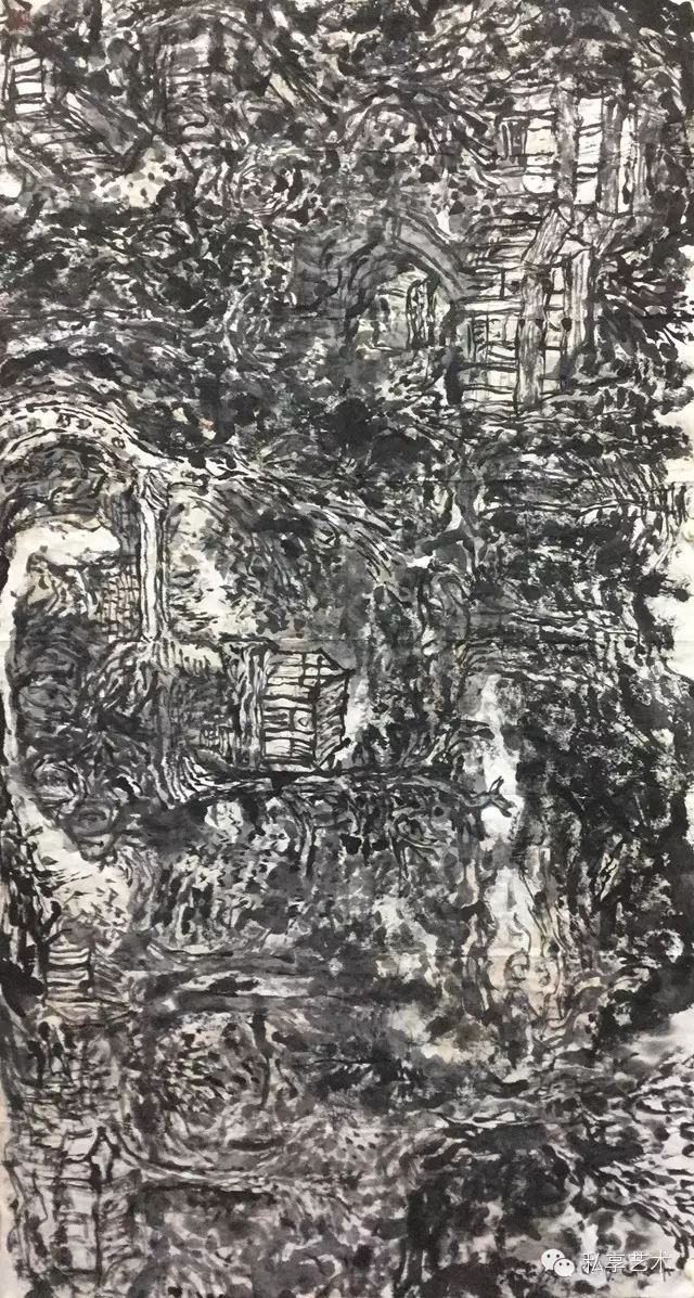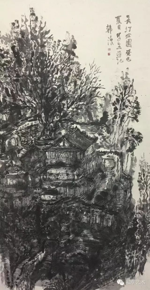 韩浪的山水画,几乎很少有设色的,即便有,也是凤毛麟角式浅绛赋色,他不同于现代很多新锐的水墨画家的是,他画的是一种真正意义上的“墨笔”,是将“水”与“墨”交融之后挥洒出的传统国画。这种“交融”结果便是,苍润的墨象中透着散逸,在散逸中饱含作者的创作理念。