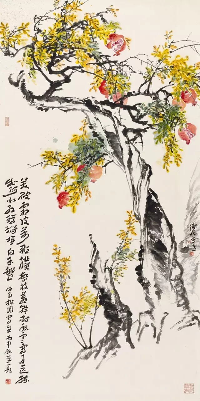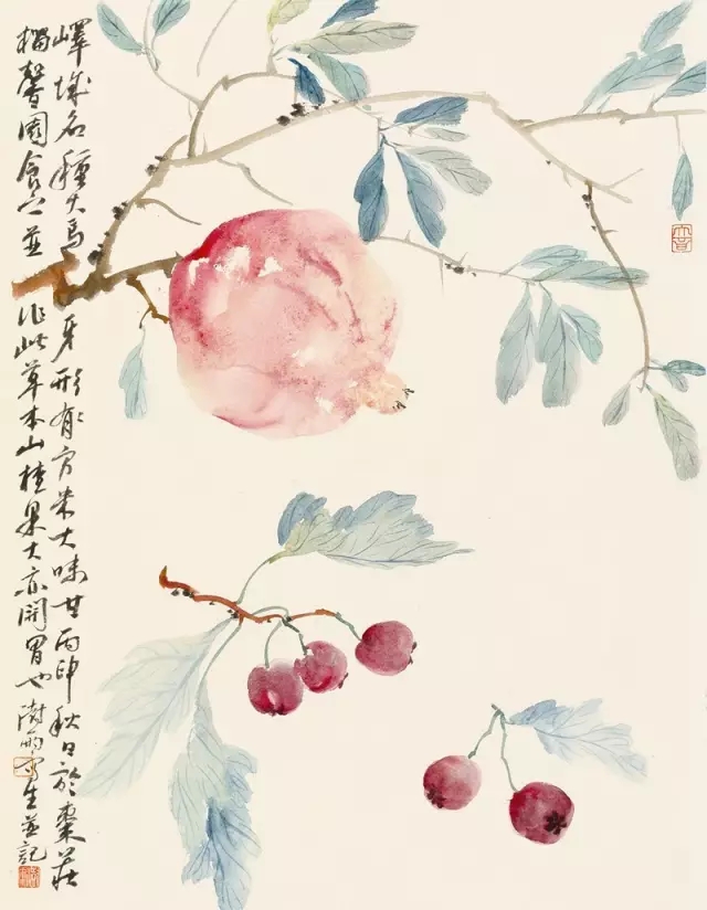 释文:笑破霜皮万颗攒,繁枝苍干耐秋寒。 写来匹练知何似,红玛瑙堆白玉盘。 澍雨榴园写生。丙申秋李一题