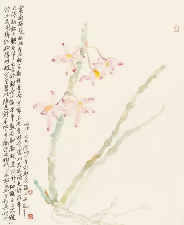 石斛数株,杂陈于地摊之上,不植于土,花开绰约,购得此枝, 写生习此后,见于本地人多捆于大树之上,不施水土,方知