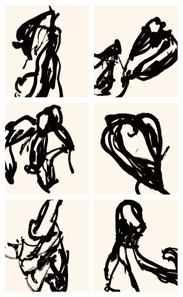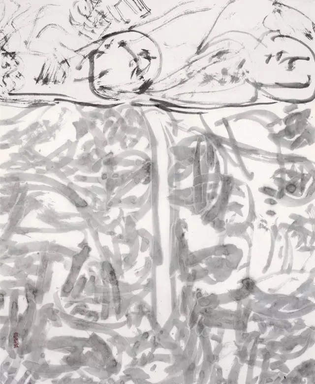与《状态-Ⅶ》类似的还有《人物》三联画,它们同样运用了“之间”策略。其人物形象,令人隐约想起一系列图像史:史前绘画,或著名的史前雕塑《霍顿都维纳斯》,杜布菲完全扁平的涂鸦作品,甚至某些现代卡通画。然而,除非你脑海里装备有一部完整的图像史,否则,它们的人物形象是极为勉强才能“读出”的。在这里,绘画性被压抑到最低程度,而书写性,它的笔触,姿势痕迹,乃至水墨晕化效果,成了最醒目的能指。