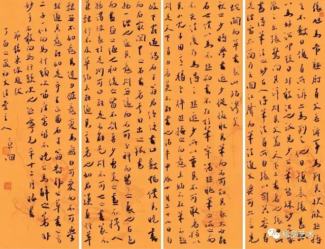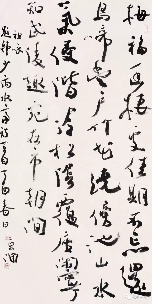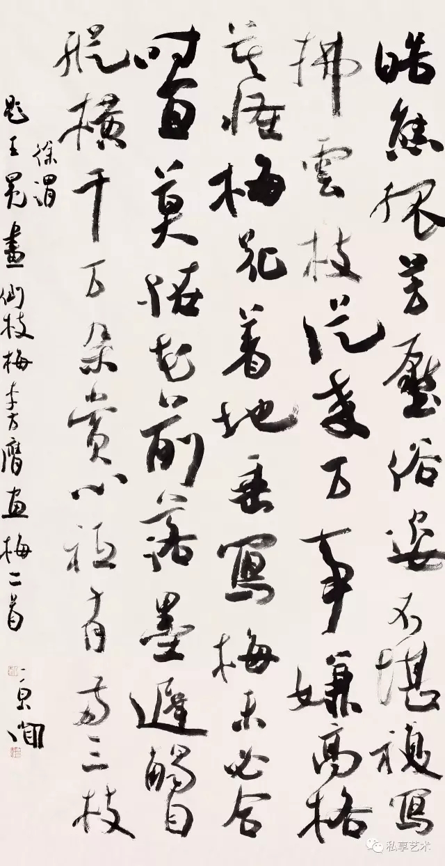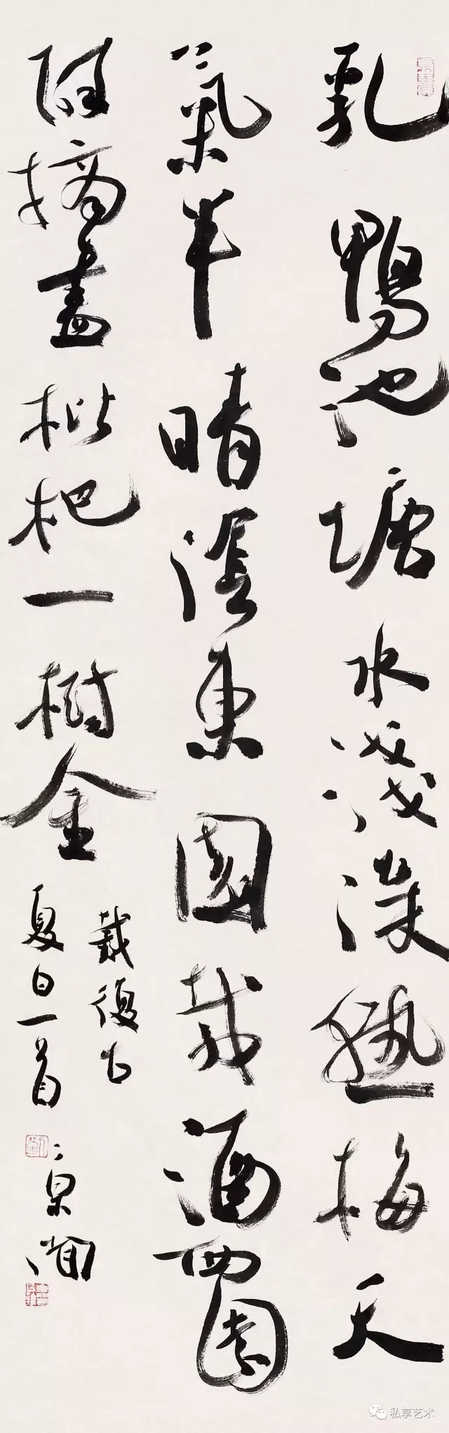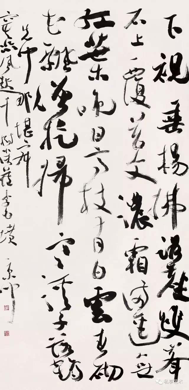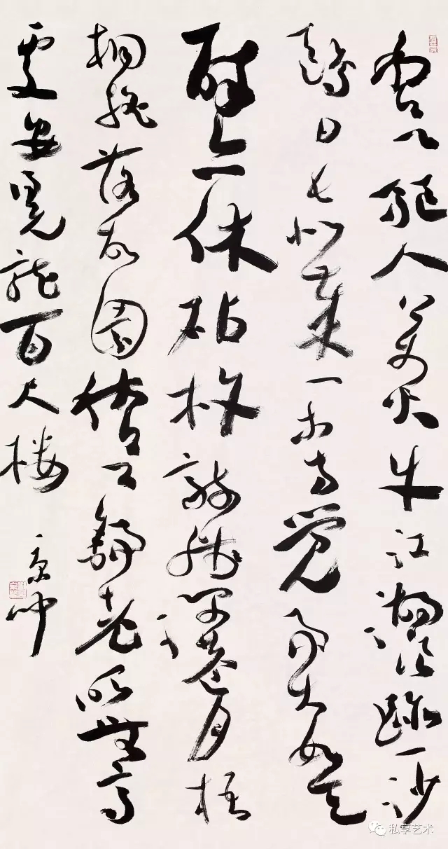 当代的草书更是“草草”,更是这个书法时代的代言,古代书法无论是小草还是大草,最基本的点划形态都是完备的、丰富的,如黄庭坚、鲜于枢、徐渭、祝枝山、王铎、傅山等书家的草书,尽管潇洒、恣肆,但我们依然能欣赏到点划的形态之美,当今的草书为追求潇洒率意而牺牲点划的基本形态和法度规则,变成了流行的“一笔书”,豪气之中透出的是浮躁、简单和苍白。东坡有云:凡世之所贵必贵其难,真书难于飘扬,草书难于严重,大字难于结密而无间,小字难于宽绰而有余。今人之书貌似潇洒,实则趋易避难,而不自知也!